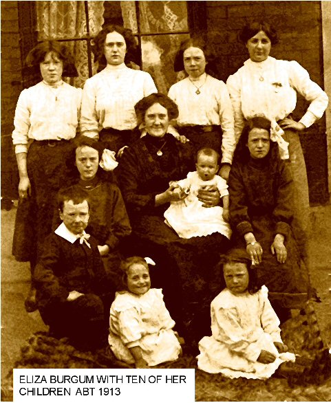 Eliza Burgum nee Wilde (1868-1947) with nine daughters and her son, Sydney. It's thought there were 12 or 13 children in total. The little