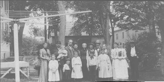 This picture was taken at 68 South State Street, in Concord, New Hampshire, the home of John and Emma Burgum. It was taken in July 1893. In the back row from the left is - Cora Estelle Read Burgum, John Fulton Burgum, Baby is Earle Benjamin Burgum, Manuel Elkin, Florence Elkin, Mary Jane Burgum Elkin, Constance Elkin, John Burgum, Emma Gannell Thompson Burgum, Mary Jane (Minnie) Burgum Lane, Edward (Ed) Lane. In the front row from the left is Emma Dell Burgum, John Francis (Frank) Burgum, Florence Isabella Burgum Wright, Shad Elkin, Marion Elkin, Sarah Rumford Burgum Noyes.
