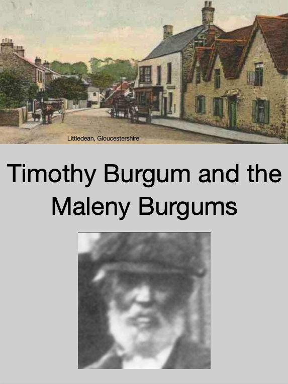 Timothy Burgum was born Littledean, Gloucestershire in 1843. He began working down the coal mines age 12 and later became a blacksmith shoeing the horses down the mines. He and his wife Mary had ten childred but only five made it to adulthood. At the age of 69 he and his daughter Lilian sailed to Australia to join his four older children. This is about Timothy and the Burgums who settled in Maleny, Queensland and begun a dynasty that continues to this day. |