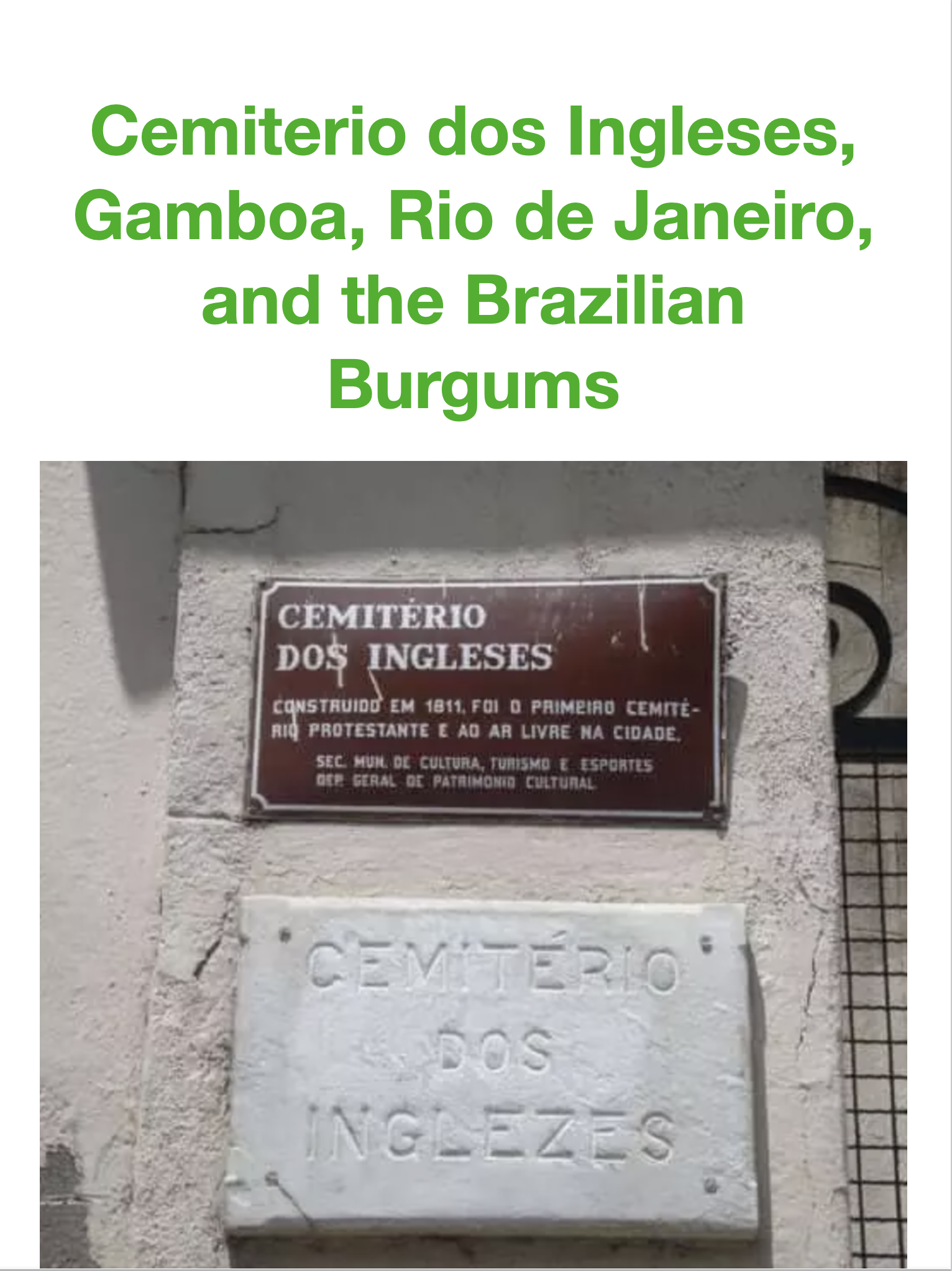 The Cemitério dos Ingleses, Gamboa, is a cemetery in Rio de Janeiro, Brazil. It is also known as the English Cemetery or the British Cemetery Gamboa. It is a beautiful place and over thirty Burgums are buried there. Who are they and what took them and their families to Brazil? Many Burgums still live in Brazil, while others returned to England. Others descended from these families settled in the USA and elsewhere. I have had the pleasure of meeting some of the Burgum clan in Brazil and this is the story of them and our shared ancestors. |