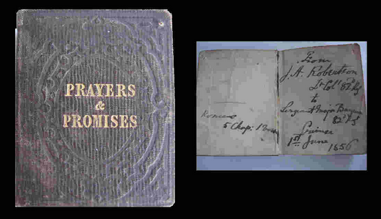 In 1856 George was presented with another book. It was a small prayer book titled 'Prayers & Promises' printed for the Religious Tract Society in London. It had gilded edges, with the binding intact, and contained relevant prayers for each month of the year. A handwritten note, in ink, on the inside opening page, read- 'From J.A. Robertson Lt Col 82nd Rgt to Serjeant Major Burgum 82nd Rgt Crimea, 1st June 1856'. An additional note on the inside cover read- 'Romans 5 Chap: 12'. | |