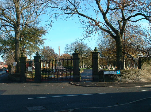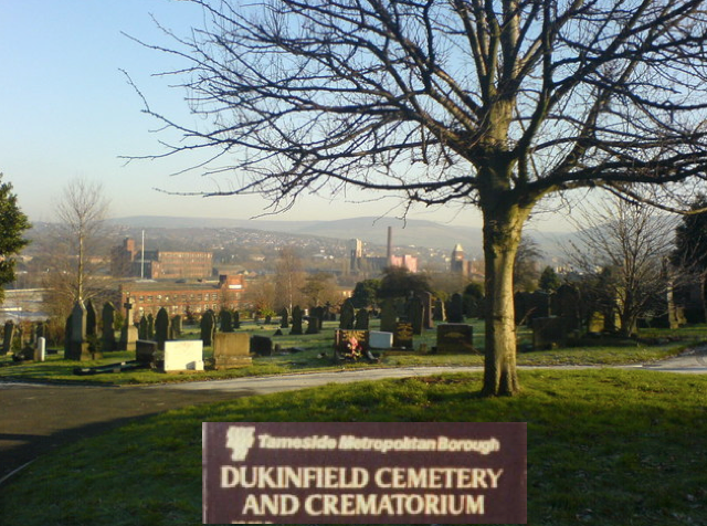 Dukinfield Cemetery in Hall Green Road, Dukinfield, where the crematorium is also situated. It was opened in 1866.