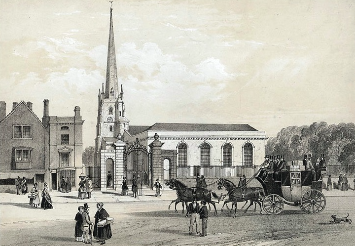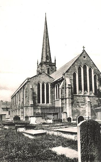 MONMOUTH ST MARY, a priory church, was dedicated to St Mary the Virgin. It was founded in 1101 and became the parish church later in the 12th century. The three-stage tower dates from the 14th century. By 1730 the church was sai to be in a "ruinous and decayed" condition and significant repairs and rebuilding took place in 1736. The spire was added in 1743, but it was in the late 18th century that the church was completely re-built; only the tower and spire survived. There are two chapels, Lady Chapel and North Chapel, and a south aisle. A tile in the south chapel displays a Bohun swan (a swan in chains), which was the emblem of Mary de Bohun, mother of Henry V, who was born in the castle nearby. |