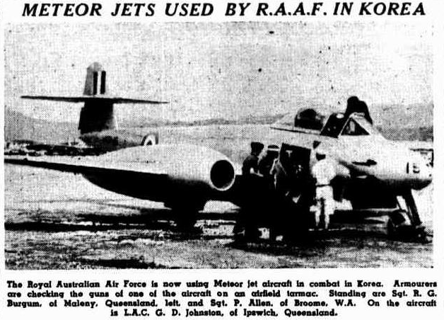The Royal Australian Air Force is now using Meteor Jet aircraft in combat in Korea. Armourers are checking the guns of one of the aircraft on an airfield tarmac.